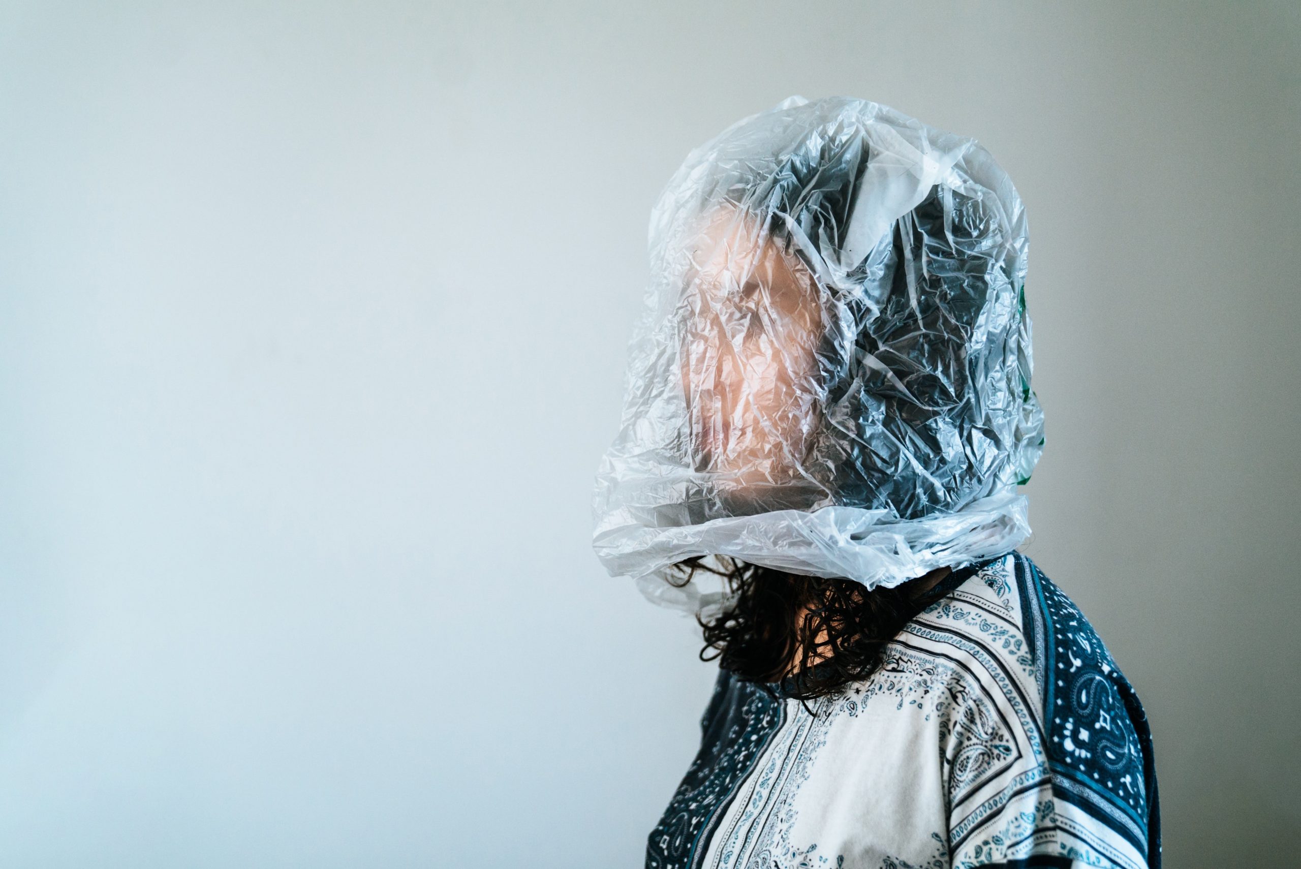 Woman with plastic bag over her head. Photo by Daniel Chekalov Unsplash